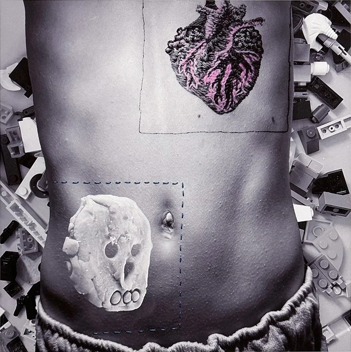 The images begin as digital collages and are then layered with paint and thread. These tactile additions emphasize the complexity and vulnerability of being human. The threads serve as metaphors for the invisible ties that bind us—messy, fragile, and deeply connective.